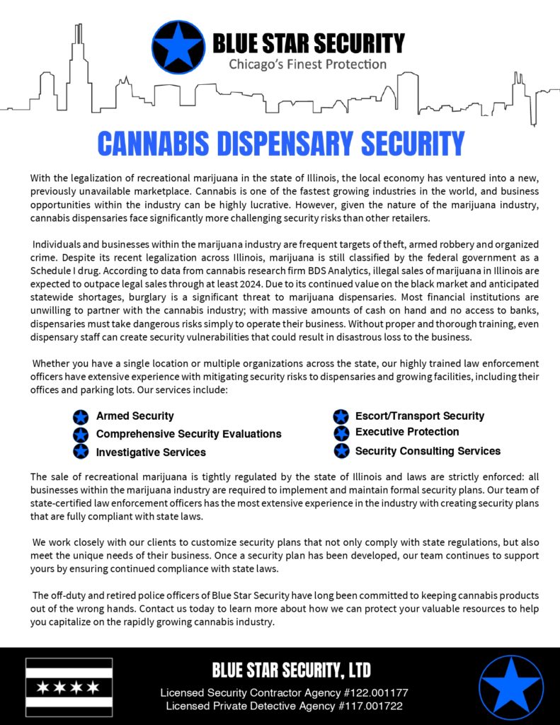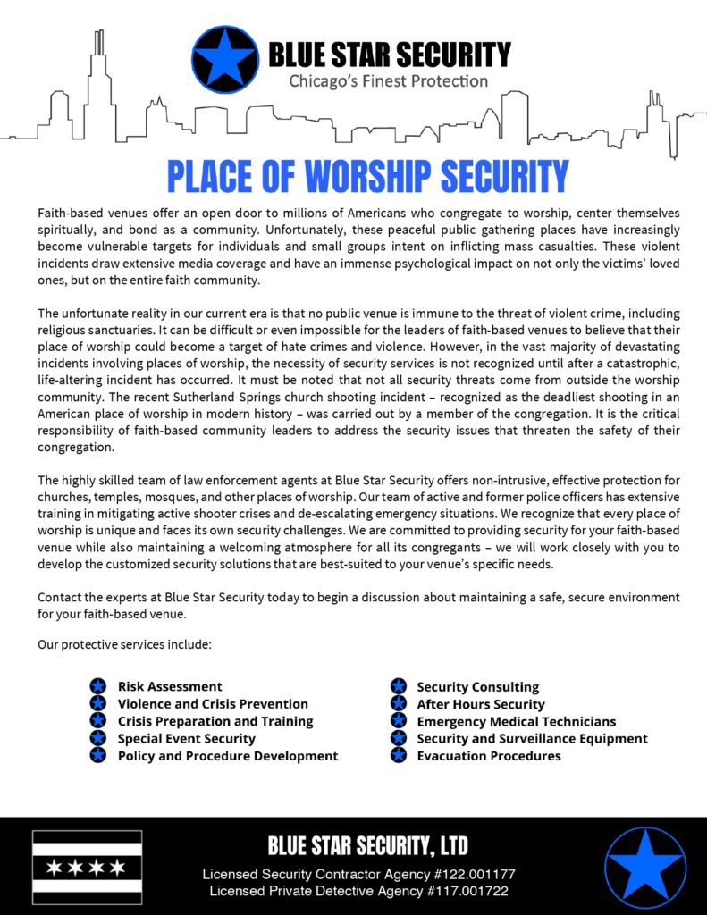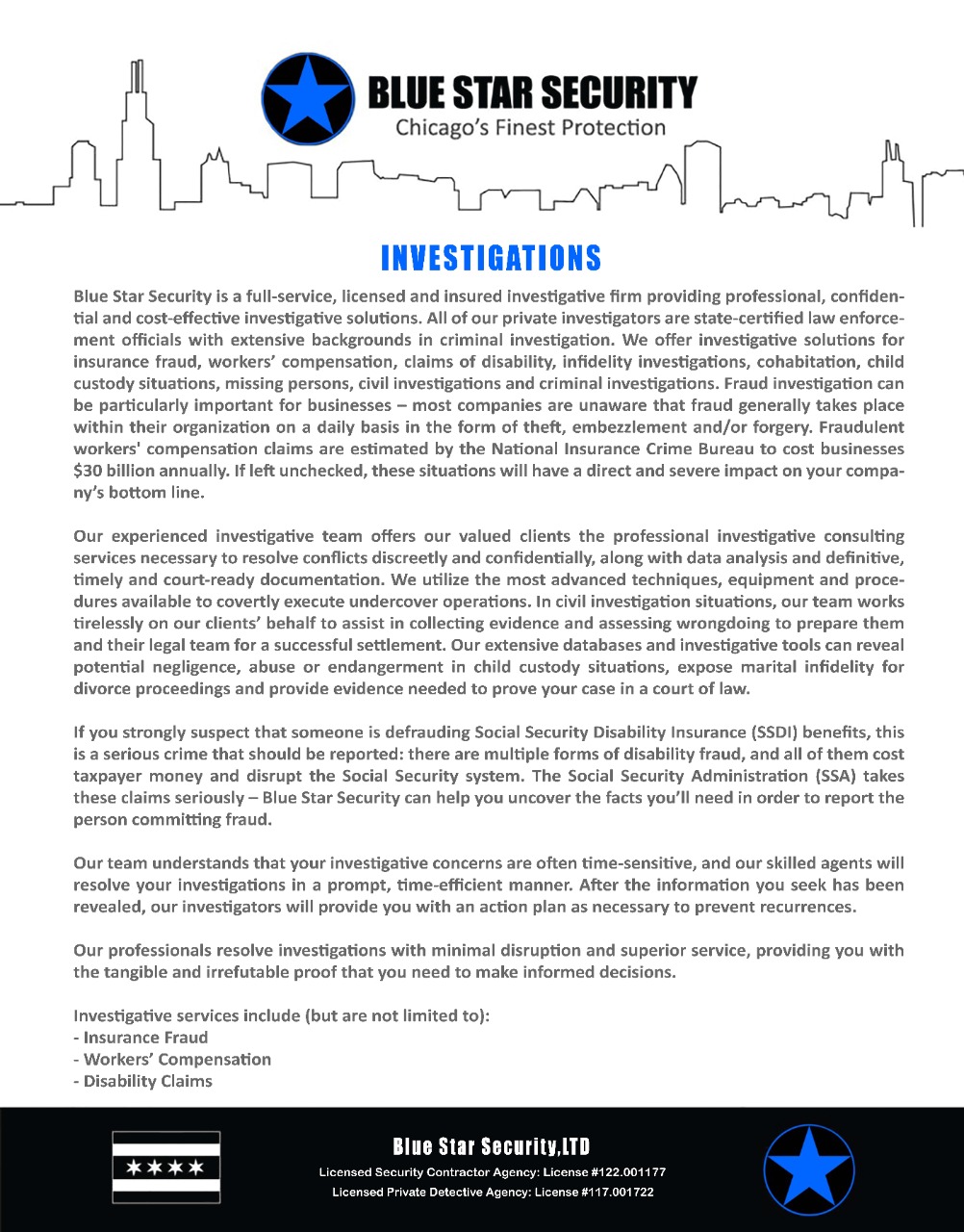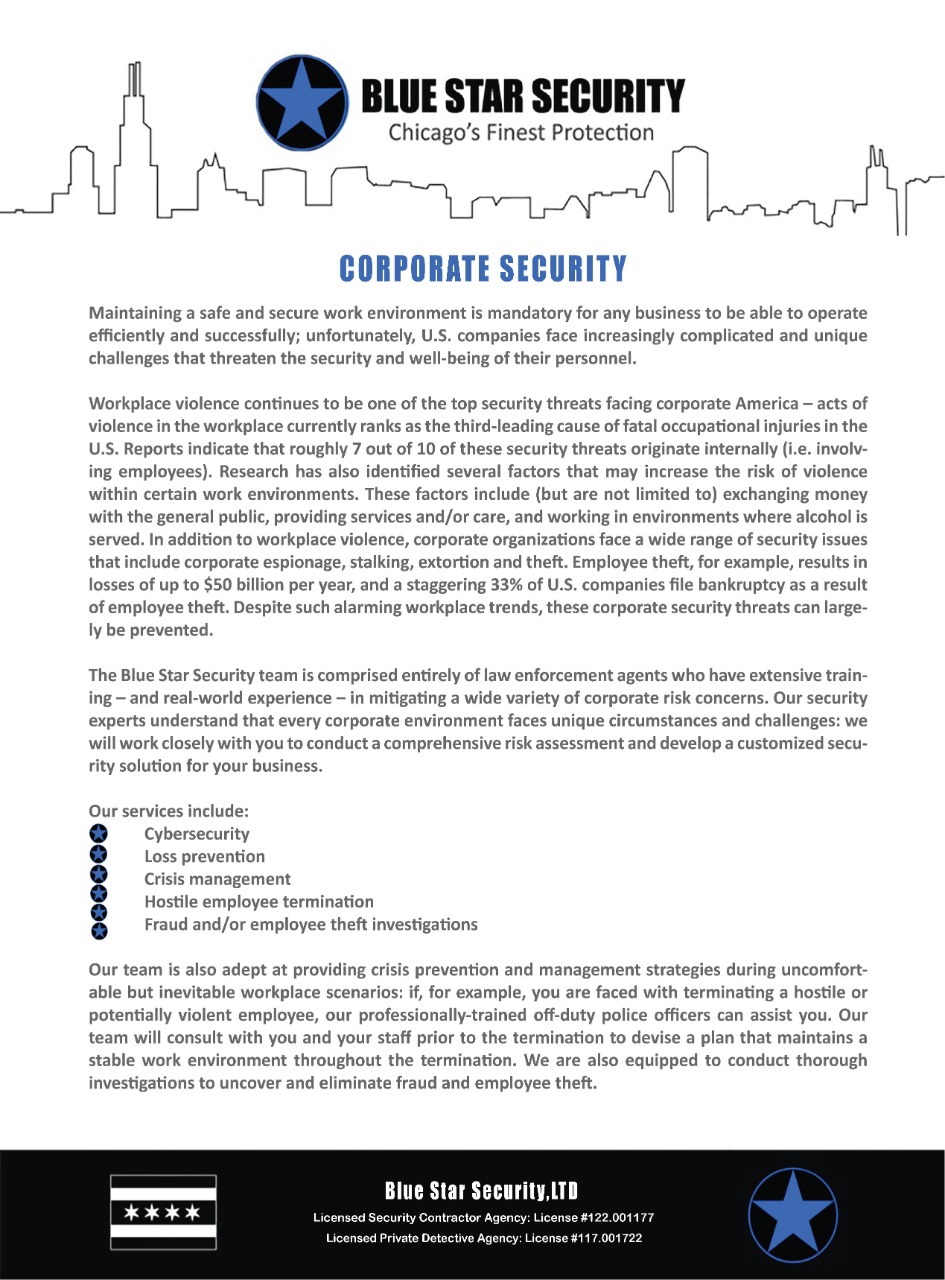 Blue Star Security is a fully licensed and insured security company in Chicago, dedicated to providing our clients with the highest standards in security. Our insurance policy limit exceeds the statutory requirements for all classifications. We provide each client with a certificate of insurance prior to starting any assignment.