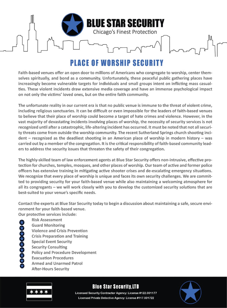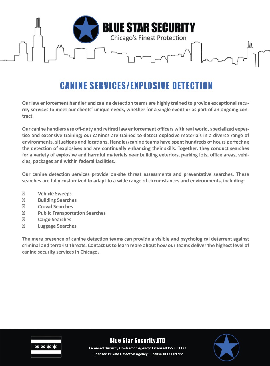 Blue Star Security is the only organization in Illinois with over 1,000 active duty and retired police officers, all of whom are W-2 employees. The Blue Star Security team consists exclusively of state certified active and retired law enforcement professionals who provide our clientele with the highest standards in security.